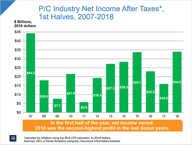 From a profitability perspective, 2018 will likely turn out to be a good year—maybe the best in more than a decade, in part because it started out quite well. The first half of 2018 produced a $6.0 billion underwriting gain (vs. a $4.6 billion loss in the first half of 2017). It is too soon to know how the storms of the third quarter will affect full-year underwriting results, but at the least this first-half profit will moderate any underwriting losses that emerge. Also, results from investing the industry’s assets rose in the first half of 2018 versus the comparable period in 2017: Net investment gains were $32.2 billion in the first half of 2018, compared to $27.0 billion in 2017, up 19.2 percent.