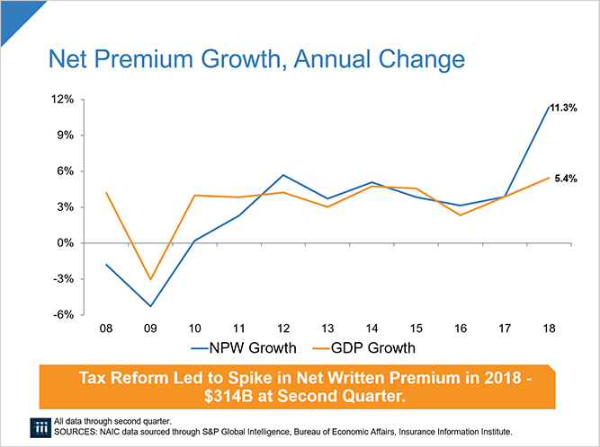 Moreover, changes in net written and net earned premiums are sometimes due to changes in reinsurance, as seems to be the case in 2018. As ISO/PCI comment, “the sharp acceleration of [net] premium growth is largely due to changes in reinsurance utilization, apparently prompted by the recent U.S. tax reform. Many insurers chose to significantly reduce the portion of premiums ceded to their non-U.S. affiliates because of the concerns about possible tax implications of the new law… [and also] one-time increases in written premiums associated with the returns of previously ceded unearned premium reserves.”