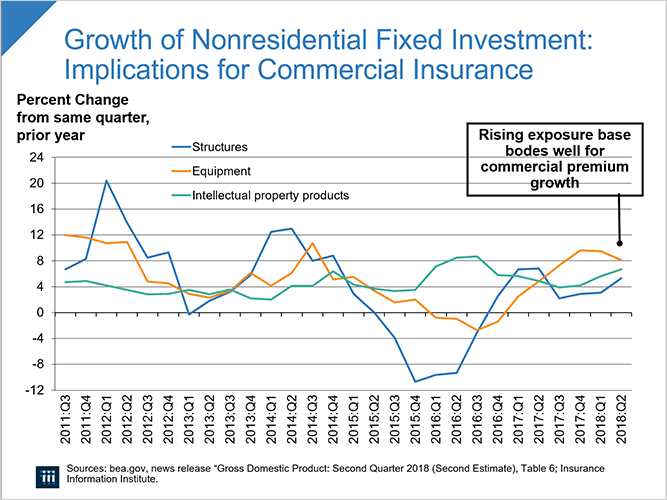 From the data available, it is not easy to determine to what extent premium growth is coming from an increase in insurance buyers, but some data are suggestive. For example, compared to the first half of 2017, the first half of 2018 saw continued growth in the number of people employed—especially those employed full-time—and net business formation and expansion. Figure 3 shows three types of business investment, all of which would imply increases in the purchase of commercial insurance. This all suggests that some people and businesses that had previously been un- or underinsured might have bought more coverage lately. Also, those who financed new cars or homes had to purchase insurance coverage to satisfy the conditions of their loans, even if their prior vehicles or residences were not insured.