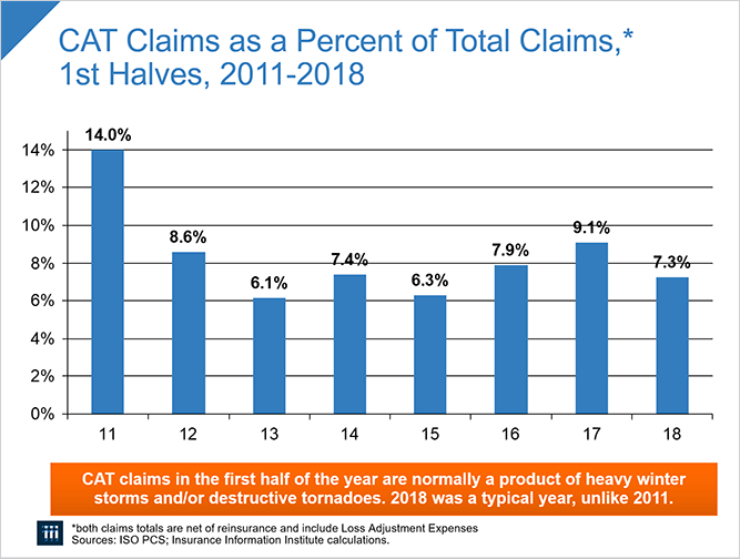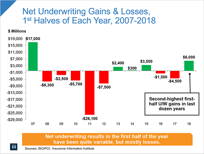ISO estimates that direct premiums written grew by about 6.0 percent. Net premiums written (for insurance subsequently to be provided) soared by 13.3 percent in the first half of 2018, up from the more typical 4.1 percent growth rate in the first half of 2017. Net earned premiums (for insurance actually provided) grew by “only” 10.2 percent, compared to growth of 3.4 percent in the comparable period in 2017.