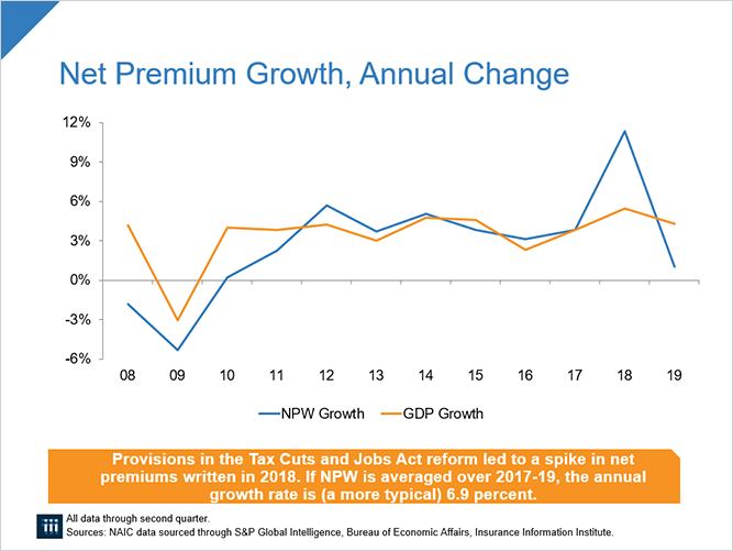 Net earned premiums (for insurance actually provided) in 2019:1H grew by 3.8 percent (to $304.0 billion), compared to growth of 10.1 percent (to $292.7 billion) in the same period in 2018. However, net earned premiums were also affected by the changes in reinsurance practices caused by the Tax Cuts and Jobs Act.