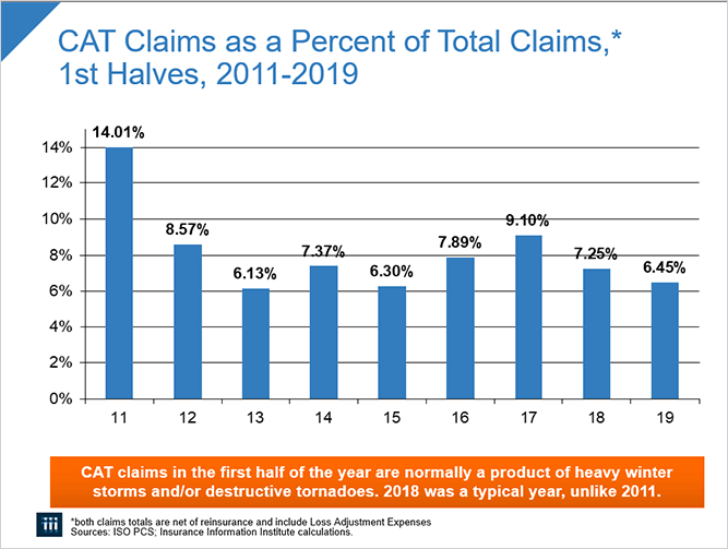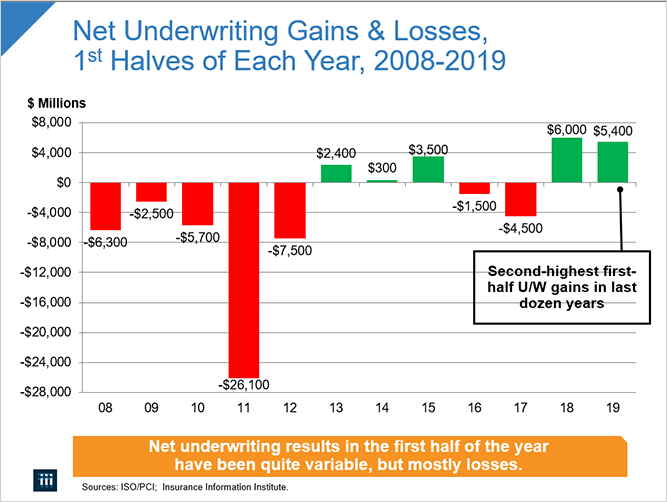 Last quarter we wrote that the first quarter of 2019 “generally went well” for the P/C industry, “although there were some bumps in the road.” Now we can say the same thing for the first half of 2019.This observation should not be surprising: in its commentary on the first half of 2019, ISO/APCIA notes that “first half underwriting gains are often concentrated in the first quarter—that was the case for 24 of the last 30 years.”