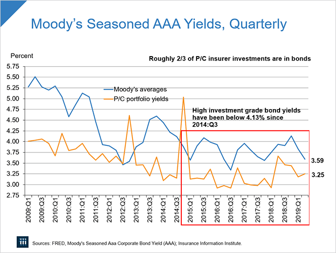 About two-thirds of investments of P/C insurers are in bonds, of which roughly 95 percent are investment grade. As Figure 5 shows, yields on seasoned AAA bonds, the highest quality, have since mid-2014 ranged between 3.3 percent and 4.1 percent. The portfolio yields obtained have tended to run about one-half to one percentage point lower.