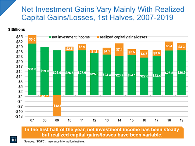 In measuring insurance company net investment gains, accounting rules recognize two components: (i) Net investment income, and (ii) realized capital gains or losses. Unrealized capital gains or losses are not considered income and affect only surplus on the balance sheet. For the first half of 2019, net investment gains were $31.2 billion, compared to $32.2 billion in the first half of 2018.