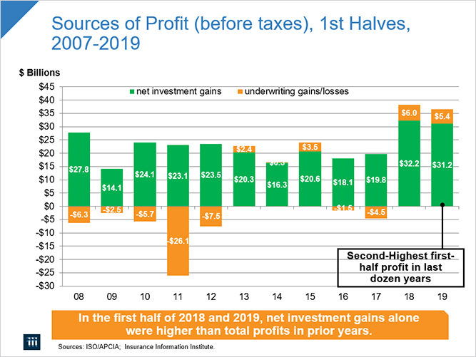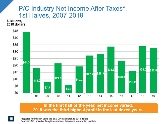 The bottom line? Net income after taxes was $32.8 billion in the first half of 2019. This is only slightly below the two recent strongest first halves. The industry’s annualized rate of return on average surplus was 8.5 percent for the first half of 2019, compared to 9.0 percent for the comparable period in the prior year.