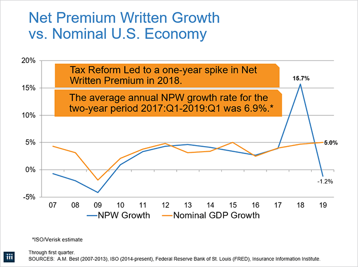 Net premiums earned. Net premiums earned for insurance that was actually provided in 2019:Q1 were $149.6 billion, up 4.6 percent over 2018:Q1. Although this was a solid increase, it fell short of the 9.4 percent growth in 2018:Q1 over the first quarter of 2017. As noted above, these growth rates are a product of a one-time effect; to get a more indicative picture, note that the average annual growth in net premiums earned over the two years from 2017:Q1 to 2019:Q1 was 7.0 percent, according to ISO.