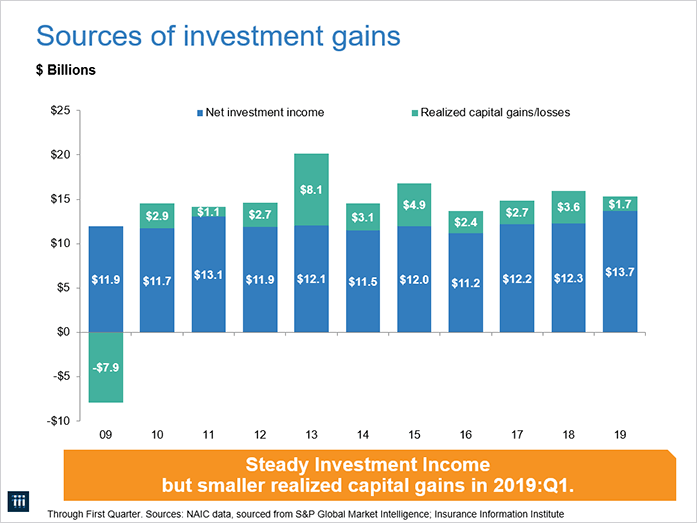 Net investment income itself has basically two elements: interest payments from bonds and dividends from stock. The industry’s net investment income for the first quarter of 2019 was $13.2 billion, up sharply—11.7 percent—from 2018:Q1 at $11.8 billion. Most of this income comes from the industry’s bond investments, which are mainly high-quality corporate bonds and municipal bonds.
