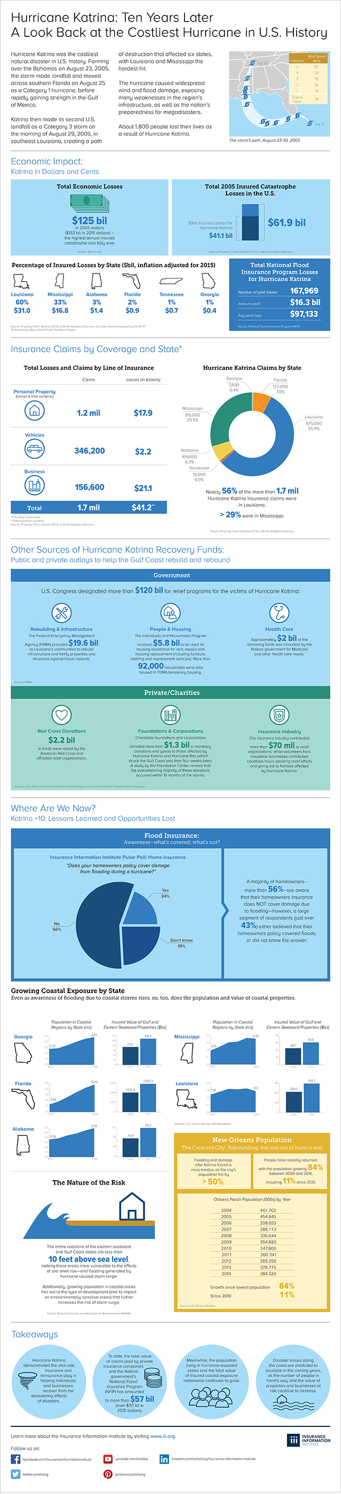 Hurricane Katrina made landfall in Louisiana as a Category 3 storm on the morning of August 29, 2005. It was to become the costliest natural disaster in U.S. history, causing widespread wind and flood damage and taking 1,800 lives. Ten years later, are we as a nation any better prepared to meet such megadisasters; what might be the impact of another Katrina today?
