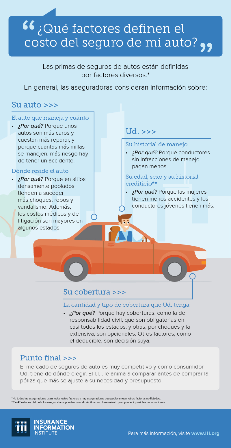 Las primas de los seguros de autos se calculan en base a muchos factores y unas aseguradoras dan más importancia a unos factores que a otros. El costo de una póliza de seguro de autos está generalmente definido por la cantidad de cobertura, el tipo de la cobertura y otros factores.