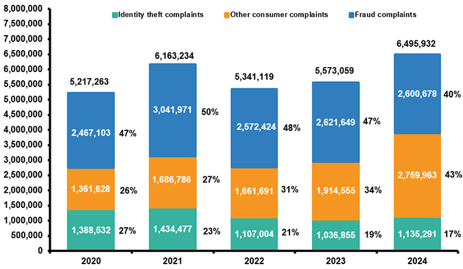(1) Consumers can report multiple types of identity theft. In 2024, 14 percent of identity theft reports included more than one type of identity theft.