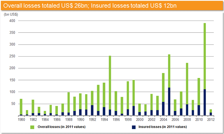 (Overall and insured losses, annual totals 1980–2011 vs. first six months 2012)
