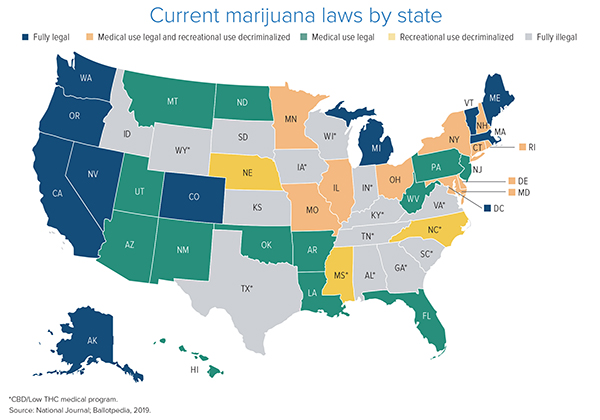 In addition to those three states, recreational marijuana is legal in seven others—Alaska, California, Maine, Massachusetts, Michigan, Nevada, and Vermont—as well as the District of Columbia.