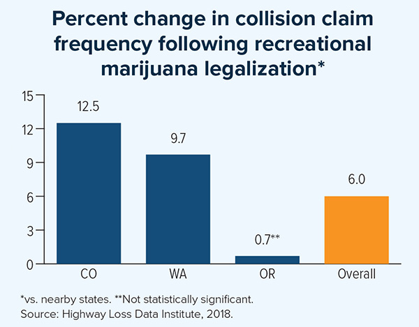 “Early evidence suggests that recreational marijuana legalization is associated with an increase in traffic accidents,” the paper states, citing a 2018 Highway Loss Data Institute (HLDI) study and police-reported crashes in states with legal recreational marijuana. HLDI found collision claim frequency was significantly higher in Colorado (+12.5 percent) and Washington (+9.7 percent) than in nearby states without recreational marijuana, although the increase in Oregon (+1 percent), the other state the HLDI study covered, was deemed statistically insignificant.