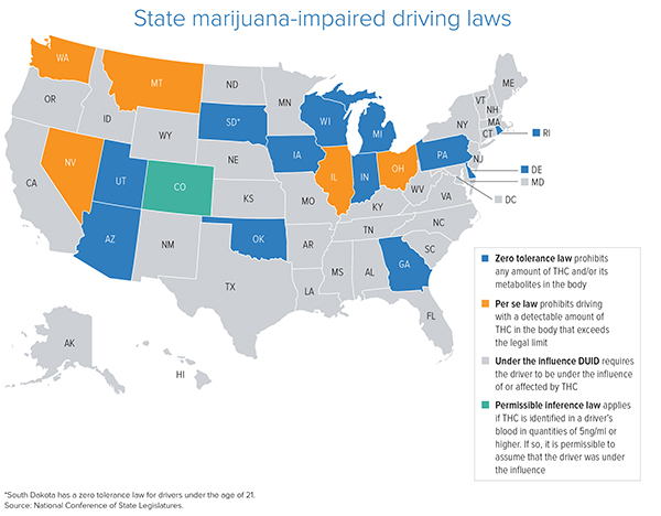 Some U.S. states hold that a motorist is driving while marijuana-impaired if the THC concentration detected in their bodies exceeds a certain limit, such as 5 nanograms per milliliter (ng/ml). THC is the main psychoactive compound found in marijuana. Other states prohibit altogether motorists from driving with any trace of THC in their bodies.