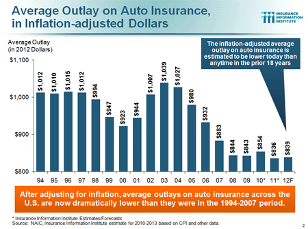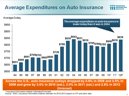 The average annual expenditure for U.S. auto insurance coverage this year is expected to total $839, less than the $842 the typical U.S. driver spent for coverage in 2004, according to I.I.I. forecasts (see Figures 1 and 2). When adjusted for inflation, auto insurance expenditures are expected to be 19 percent lower in 2012 than in 2003 and lower than at any point in nearly 20 years.